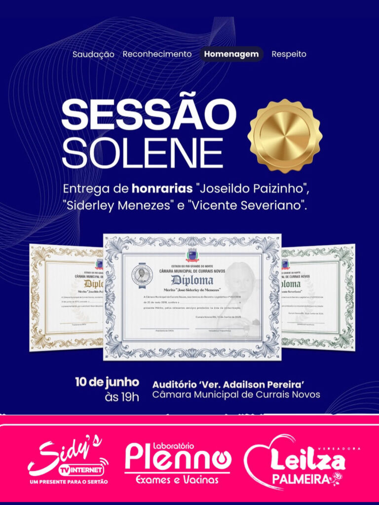 A Câmara Municipal de Currais Novos realiza uma importante solenidade para entrega de comendas que levam os nomes de figuras emblemáticas da cidade. As honrarias reconhecem cidadãos que se destacam em diferentes áreas, perpetuando a memória de personalidades que marcaram a história do município com sua atuação exemplar.